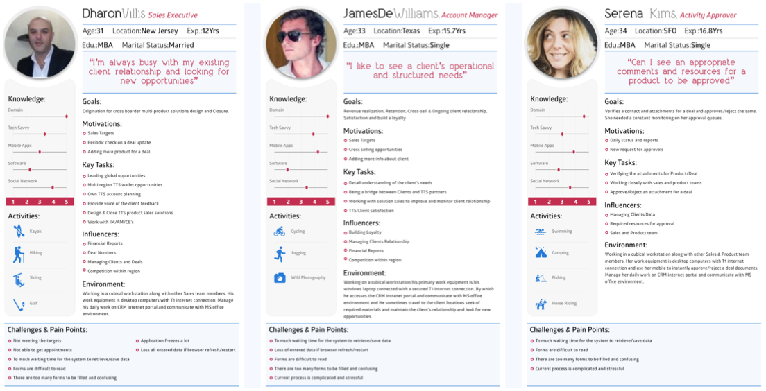 Based on preliminary interviews with stakeholders and an eco system study, I was able to identify four different key personas who play a significant role in the prospect deal life cycle, as well as one secondary (CS Team) user group.